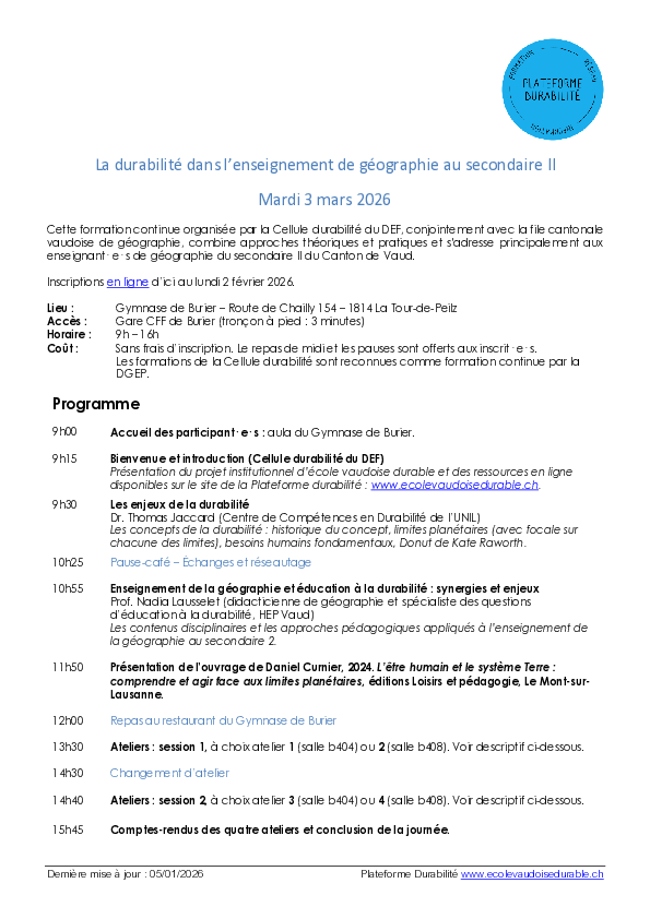 Le 3 mars 2026, la Cellule durabilité du DEF, en collaboration avec la file cantonale de géographie, organise une formation continue sur la durabilité dans l’enseignement de la géographie. Les inscriptions se font à l'aide du formulaire d'inscription et sont ouvertes jusqu'au lundi 2 février.